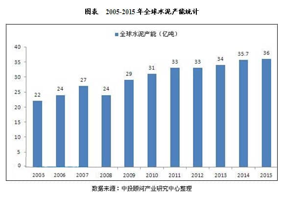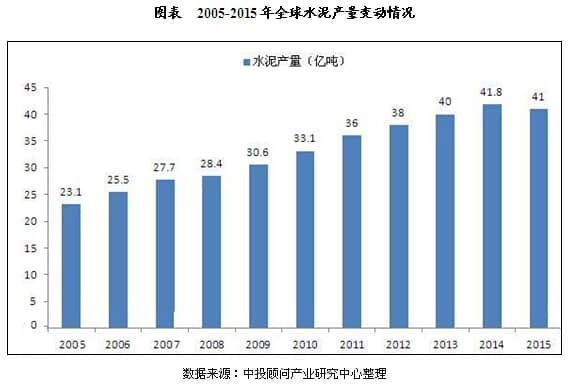 2015年全球水泥產(chǎn)量為41億噸,與2014年的41.8億噸相比,僅僅增加了0.8億噸。2005年全球水泥產(chǎn)量為23.1億噸,十年來全球水泥產(chǎn)量增長了近一倍。
