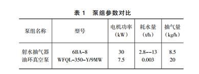 原射水抽汽系統(tǒng)動力設備是兩臺射水泵電動機,一用一備?,F(xiàn)在新安裝的油環(huán)真空泵組動力設備是兩臺真空泵電動機,一用一備。所以節(jié)電效益就是兩種泵電動機功率對比。參數(shù)對比見表1。