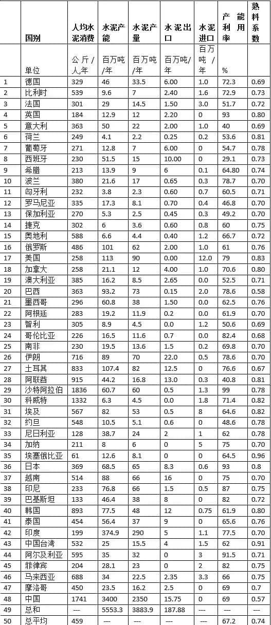 表1 世界主要國(guó)家(地區(qū))水泥產(chǎn)能利用率及其熟料系數(shù)匯總圖