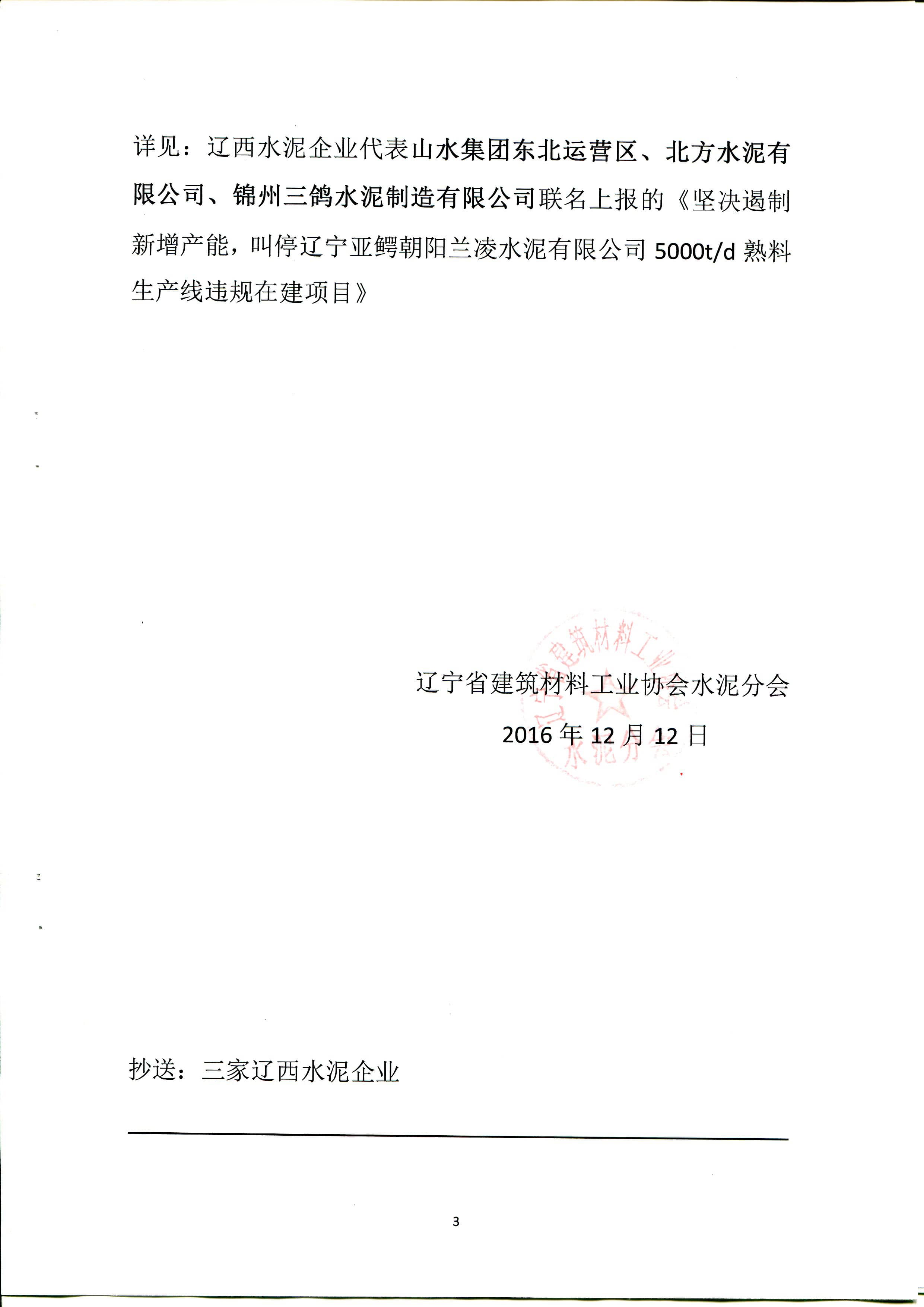 山水水泥、北方水泥、三鴿水泥、遼寧建材協(xié)會聯(lián)名舉報蘭凌水泥違規(guī)建線