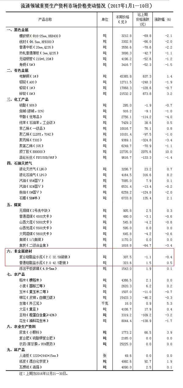 流通領(lǐng)域重要生產(chǎn)資料市場價(jià)格變動情況(2017年1月1-10日) 國家統(tǒng)計(jì)局