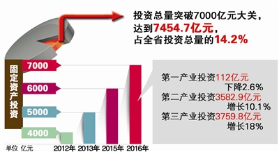 2016年,在服務(wù)業(yè)投資的強(qiáng)力推動下,青島市固定資產(chǎn)投資保持了溫和換擋發(fā)展,投資總量突破7000億元大關(guān),達(dá)到7454.7億元,占全省投資總量的比重為14.2%,占比同比提升0.4個百分點;投資增速13.7%,分別高于全國、全省平均增速5.6個和3.2個百分點。