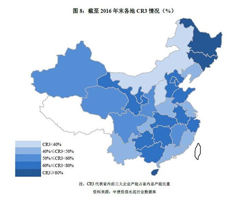 分區(qū)域看,兩湖、長(zhǎng)三角等地區(qū)較好的競(jìng)爭(zhēng)秩序和主導(dǎo)企業(yè)間相對(duì)成熟的競(jìng)爭(zhēng)策略利于區(qū)域價(jià)格維持合理水平;東北地區(qū)黑吉兩省集中度雖較高,但脫離需求基礎(chǔ)的協(xié)同效果已逐漸趨弱,正如上文所提,2016年?yáng)|北地區(qū)水泥價(jià)格漲幅全國(guó)墊底;山西和內(nèi)蒙是全國(guó)水泥區(qū)域產(chǎn)能集中度最低的兩個(gè)省份,區(qū)域內(nèi)尚未形成具有明顯優(yōu)勢(shì)的龍頭企業(yè),低迷的需求疊加較差的競(jìng)爭(zhēng)秩序?qū)ξ磥韰^(qū)域價(jià)格走勢(shì)形成制約。