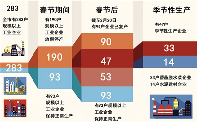截至2月20日,巴彥淖爾市全市規(guī)模以上工業(yè)企業(yè)放假停產(chǎn)已復(fù)產(chǎn)的有90戶企業(yè),如剔除47戶季節(jié)性生產(chǎn)企業(yè)(33戶番茄脫水菜企業(yè)、14戶水泥建材企業(yè)),開工率達到81.3%,同比增長10.2個百分點。
