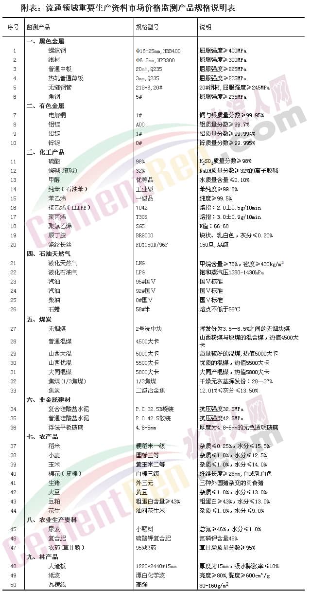 流通領(lǐng)域重要生產(chǎn)資料市場價格監(jiān)測內(nèi)容包括9大類50種產(chǎn)品的價格。類別與產(chǎn)品規(guī)格說明詳見附表。