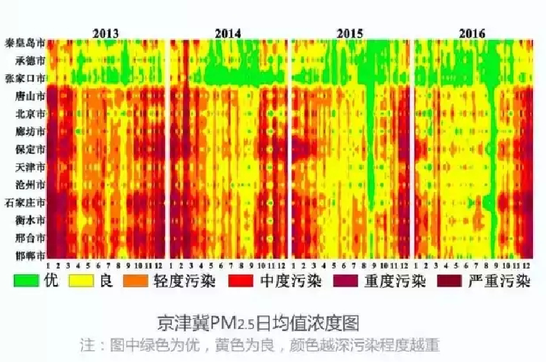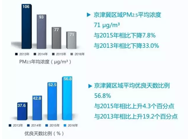 經(jīng)過三年的協(xié)同治理,京津冀區(qū)域四項主要污染物濃度全面下降,空氣質(zhì)量取得了整體改善。2016年,京津冀區(qū)域13個城市PM2.5、PM10、SO2和NO2的平均濃度分別為71、119、31和49微克每立方米,較2013年相比分別下降33%、34%、55.6%和4.5%,區(qū)域平均優(yōu)良天數(shù)比例為56.8%,較2013年相比上升19.2%,區(qū)域平均重污染天數(shù)則從2013年的76天減少到33天,下降56.1%。