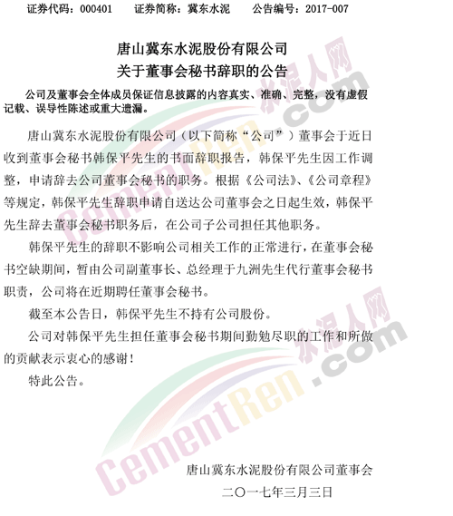 冀東水泥3月3日晚間公告,公司董事會近日收到董事會秘書韓保平先生的書面辭職報告,韓保平先生因工作調(diào)整,申請辭去公司董事會秘書的職務。韓保平先生辭去董事會秘書職務后,在公司子公司擔任其他職務。