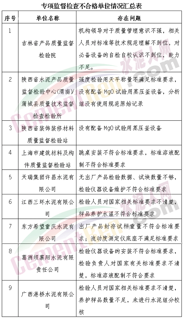 為推進水泥產(chǎn)品質(zhì)量提升工作,2016年,質(zhì)檢總局產(chǎn)品質(zhì)量監(jiān)督司針對水泥產(chǎn)品質(zhì)量檢驗能力比對試驗結(jié)果不合格單位的整改情況,組織開展了專項監(jiān)督檢查?,F(xiàn)將檢查發(fā)現(xiàn)的問題和處理意見通報如下: