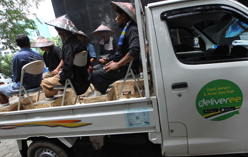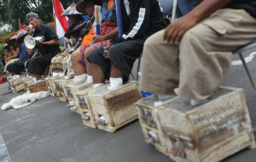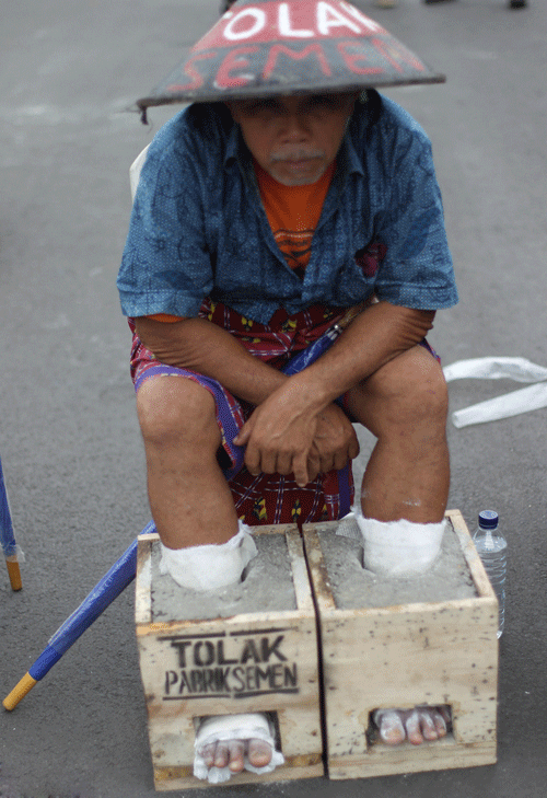 當(dāng)?shù)貢r(shí)間2017年3月14日,印尼雅加達(dá),Kendeng山區(qū)農(nóng)民抗議當(dāng)?shù)亟ㄔ焖鄰S,將雙腳裝在用水泥灌注的木箱里。