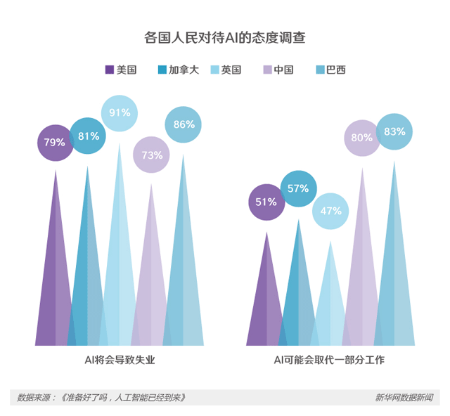 根據(jù)相關(guān)調(diào)查結(jié)果顯示,面對即將到來的人工智能時代,英國人對于自己的工作有強(qiáng)烈的危機(jī)感。相對來說,中國、巴西等新興市場國家對于人工智能帶來的挑戰(zhàn)保持相對樂觀。