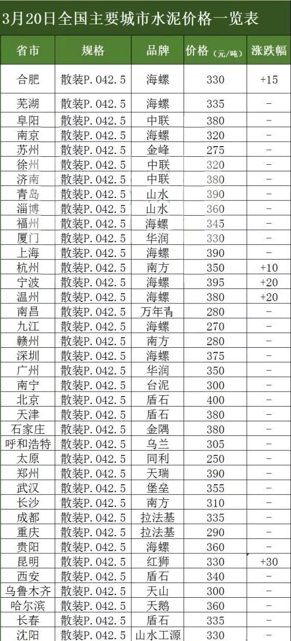 附:3月20日全國(guó)主要城市水泥價(jià)格一覽表