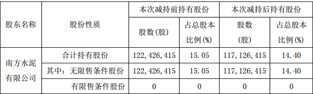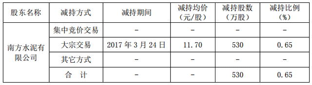 南方水泥自 2016 年 12 月 13 日至 2017 年 3 月 24 日期間通過大宗交易方式累計(jì)減持 59,980,900 股,減持股份比例占公司總股本的 7.37%。自最近一次披露權(quán)益變動報(bào)告書起至本次減持后,南方水泥累計(jì)減持公司股份 19,300,000 股,占公司總股本的 2.37%。