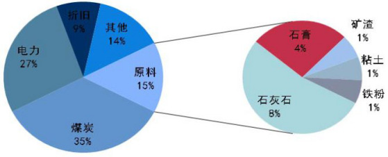 其次,產(chǎn)能的開關(guān)成本及生產(chǎn)成本相對較低。從近幾年價格出現(xiàn)大幅波動的原因不難看出一點,產(chǎn)能的發(fā)揮程度直接導致價格波動的大小。16年底至17年初,由于環(huán)保檢查要求嚴格、錯峰停產(chǎn)政策落實到位,地區(qū)水泥、熟料供給趨緊,導致水泥價格堅挺、熟料價格一度出現(xiàn)淡季上漲的情況。如河南部分地區(qū)16年8月份開始的環(huán)保整治和錯峰停產(chǎn),力度從產(chǎn)能發(fā)揮控制50%以內(nèi)到全面停產(chǎn),導致P.O42.5散裝價格從260元/噸飆升至最高450元噸,最高單次漲幅高達驚人的100元/噸。另一方面水泥、熟料的生產(chǎn)成本相對較低,該屬性決定了其產(chǎn)能相對可控。17年2月份指數(shù)提前出現(xiàn)上漲也是因為華東地區(qū)大范圍30-45天的錯峰停產(chǎn)導致。從水泥的生產(chǎn)成本上來看,主要的成本集中在煤炭和電力上,兩者相加約占總成本的62%,因此以上兩者的價格波動也影響水泥的價格調(diào)整。