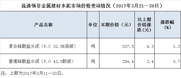 復(fù)合硅酸鹽水泥(P.C 32.5R袋裝)本期價(jià)格327.5元/噸 比上期價(jià)格上漲4.3元/噸,漲幅約1.3%