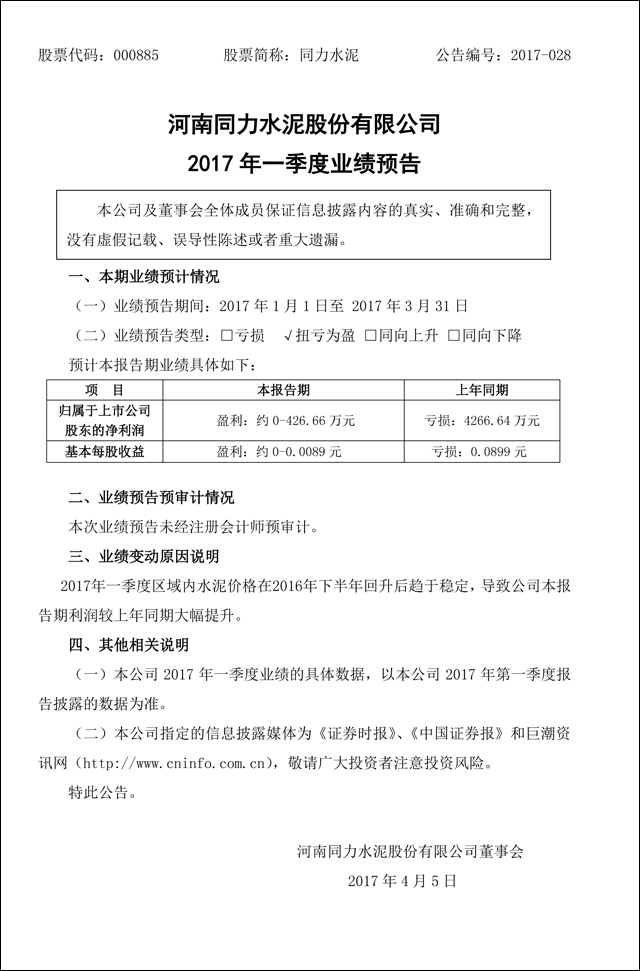 同力水泥(000885)4月5日晚間公告,公司預(yù)計2017年一季度實現(xiàn)扭虧,盈利不超過426.66萬元,上年同期為虧損4266.64萬元;扭虧原因為當(dāng)季區(qū)域內(nèi)水泥價格在2016年下半年回升后趨于穩(wěn)定。同力水泥今日漲停,報收24.09元/股。