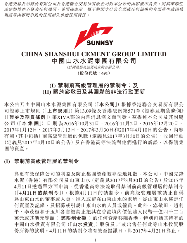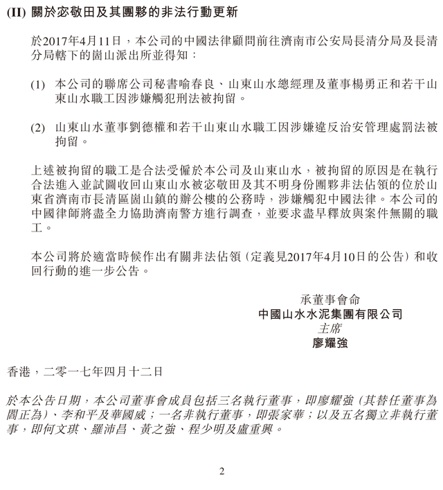(1) 公司的聯(lián)席公司秘書(shū)喻春良、山東山水總經(jīng)理及董事楊勇正和若干山東山水職工因涉嫌觸犯刑法被拘留。