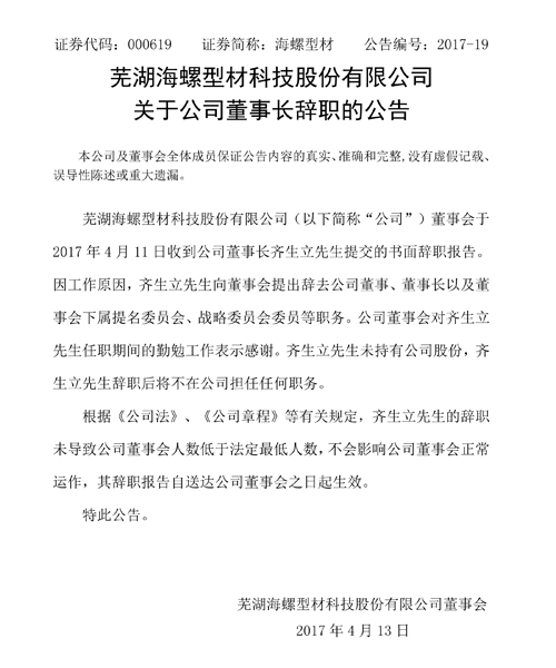 4月12日晚間,海螺型材發(fā)布公告稱,公司董事會(huì)于2017年4月11日收到公司董事長齊生立先生提交的書面辭職報(bào)告。因工作原因,齊生立先生向董事會(huì)提出辭去公司董事、董事長以及董事會(huì)下屬提名委員會(huì)、戰(zhàn)略委員會(huì)委員等職務(wù)。公司董事會(huì)對(duì)齊生立先生任職期間的勤勉工作表示感謝。齊生立先生未持有公司股份,齊生立先生辭職后將不在公司擔(dān)任任何職務(wù)。