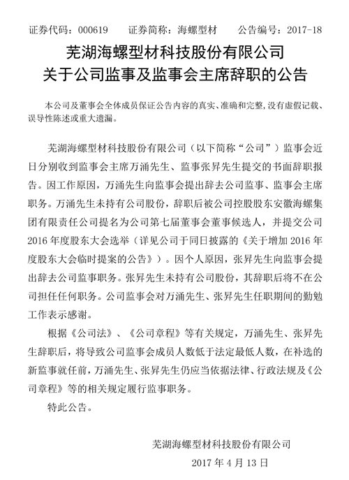 海螺型材同時(shí)還公布了公告稱:上市公司監(jiān)事會(huì)主席萬涌先生、監(jiān)事張昇先生辭職公告原文如下: