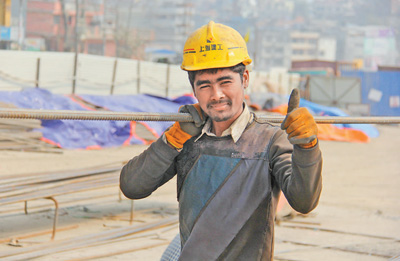 正在施工現(xiàn)場的尼泊爾建筑工人坦卡扛著鋼筋,對記者豎起大拇指
