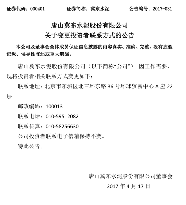 冀東水泥4月17日發(fā)布晚間公告稱,因工作需要,變更投資者相關聯(lián)系方式。公告原文如下: