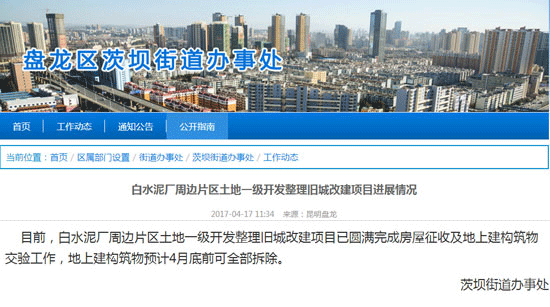 經(jīng)過近4個月的時間,白水泥廠項目土地一級開發(fā)整理工作顯然已經(jīng)取得明顯進展。根據(jù)昆明盤龍區(qū)茨壩街道辦事處發(fā)布的消息,白水泥廠周邊片區(qū)土地一級開發(fā)整理舊城改建項目已經(jīng)完成了房屋征收及地上建構(gòu)筑物交驗工作,地上建構(gòu)筑物預計4月底前可全部拆除。也就是說,白水泥廠項目土地一級開發(fā)整理工作已經(jīng)進入拆除階段,地上建筑物在4月底前可全部拆除。如無意外,地上建筑物拆除后,相繼的土地平整工作等也可展開,土地的出讓為時不遠。