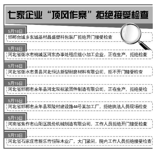 5月15日,第十督查組對河北省邯鄲市永年縣河北雙標緊固件制造有限公司進行檢查時,該公司正在生產,該公司拒絕檢查;當日,督查組在河北省邯鄲市永年縣對雙陵村建設路44號某加工廠檢查時,該廠正在生產,拒絕執(zhí)法人員現(xiàn)場檢查。