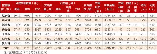 截至2017年5月28日20:00,共計受理舉報35523個(其中,來電舉報20811個,來信舉報14712個);經(jīng)梳理分析并合并重復(fù)舉報,累計向被督察地方交辦有效舉報28966件。地方已辦結(jié)23599件,責(zé)令整改20359家,立案處罰7086家,共計罰款33587.86萬元;立案偵查354件,行政和刑事拘留355人,約談6079人,問責(zé)4018人(具體情況詳見附表)。