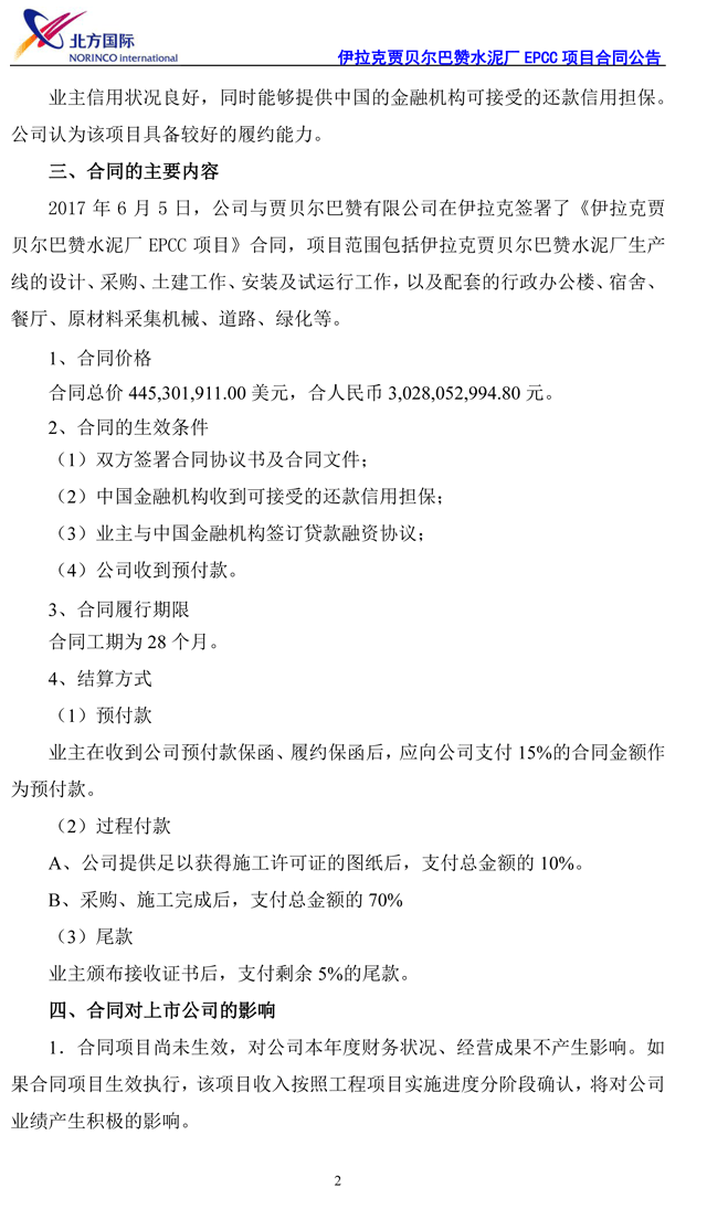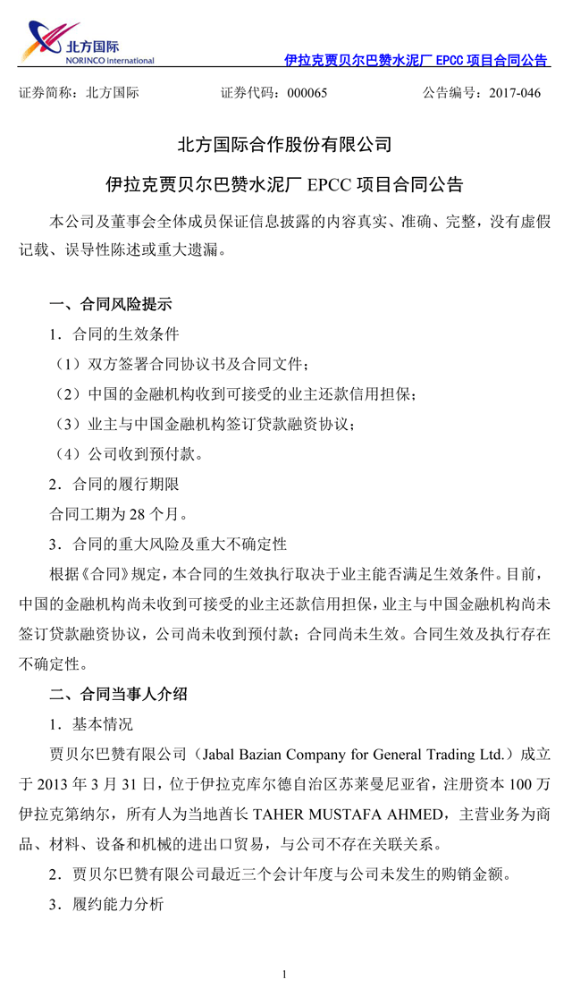 2017年6月5日,北方國際與賈貝爾巴贊有限公司在伊拉克簽署合同,項(xiàng)目范圍包括伊拉克賈貝爾巴贊水泥廠生產(chǎn)線的設(shè)計、采購、土建工作、安裝及試運(yùn)行工作,以及配套的行政辦公樓、宿舍、餐廳、原材料采集機(jī)械、道路、綠化等。合同總價445,301,911.00美元,合人民幣3,028,052,994.80元。