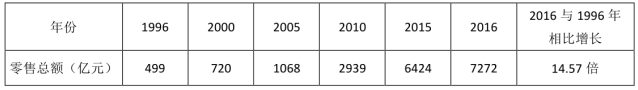 3、2016年社會消費(fèi)品零售總額是1996年的14.57倍。