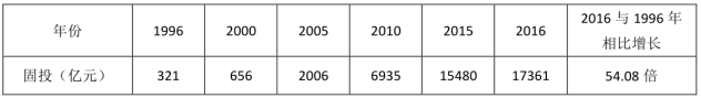 2、2016年全社會固定資產(chǎn)投資是1996年的54.13倍。