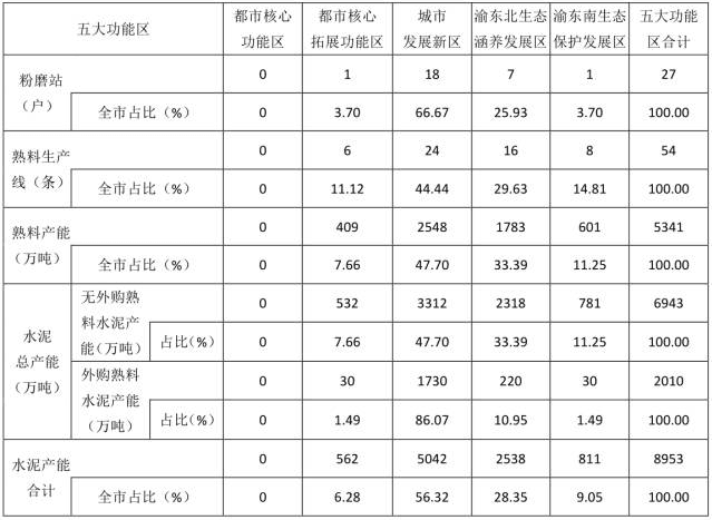 說明:(1)因貫徹落實(shí)渝府發(fā)[2014]24號文件精神,都市核心功能區(qū)1戶水泥企業(yè)、2條生產(chǎn)線,2016年底政府強(qiáng)行關(guān)閉,故未在統(tǒng)計(jì)數(shù)內(nèi)。(2)水泥產(chǎn)業(yè)布局集中在城市發(fā)展新區(qū)12個區(qū)縣,符合五大功能區(qū)定位。