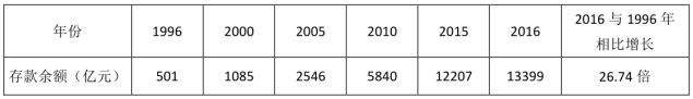 6、2016年城鄉(xiāng)居民人民幣儲蓄存款年末余額是1996年的26.76倍。