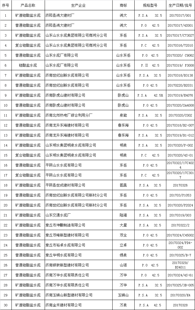 2017年3-5月,濟南市質(zhì)量技術(shù)監(jiān)督局組織開展了通用硅酸鹽水泥產(chǎn)品質(zhì)量市監(jiān)督抽查。本次共抽查了全市20家企業(yè)生產(chǎn)的30批次產(chǎn)品。本次抽查的產(chǎn)品全部合格。