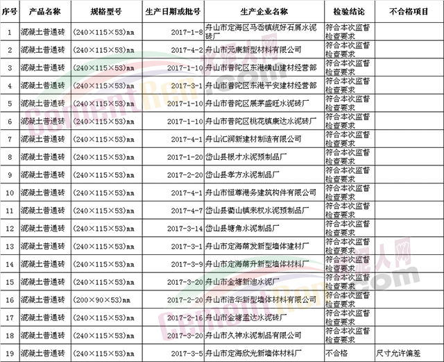 月14日,舟山市市場(chǎng)監(jiān)督管理局官網(wǎng)公布2017年二季度舟山市混凝土普通磚產(chǎn)品市級(jí)監(jiān)督抽查結(jié)果,該局共抽查了19家企業(yè)的19批次混凝土普通磚產(chǎn)品,合格18批次,不合格1批次,批次不合格率為5.3%。