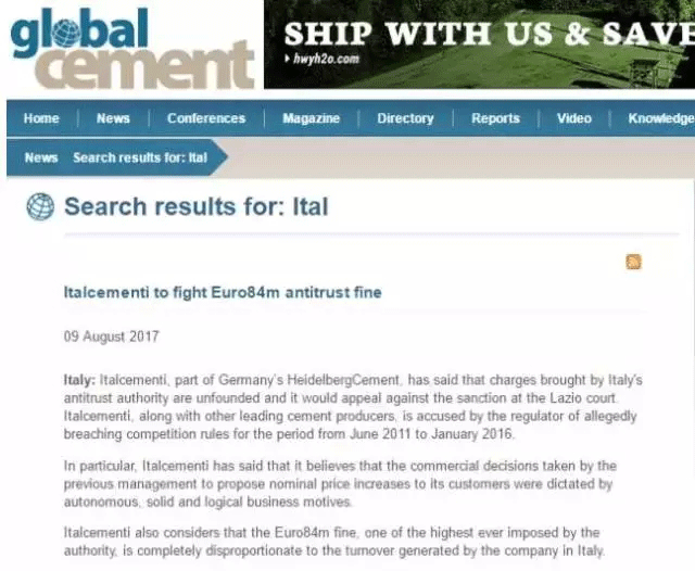 意大利水泥則解釋稱公司此前管理層對(duì)他們的客戶提出名義價(jià)格上漲的商業(yè)決策是符合自由市場(chǎng)規(guī)則的,是合乎商業(yè)邏輯動(dòng)機(jī)的。意大利水泥同時(shí)還認(rèn)為意大利反壟斷局提出了8000萬(wàn)歐元的最高反壟斷罰款是和公司的在意大利的營(yíng)業(yè)額完全不成比例的,過于高昂。