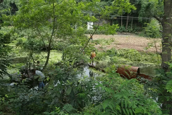 8月11日上午,記者在宇基水泥廠看到,工廠已全面停產(chǎn),在廠區(qū)水泥排料口已進(jìn)行密封處理;在廠房河道附近,工人們正在緊張建設(shè)水槽、沉砂池、限流井,以保證廢水過濾處理;河道上,工人們正在進(jìn)行打撈水葫蘆和撈淤整治。