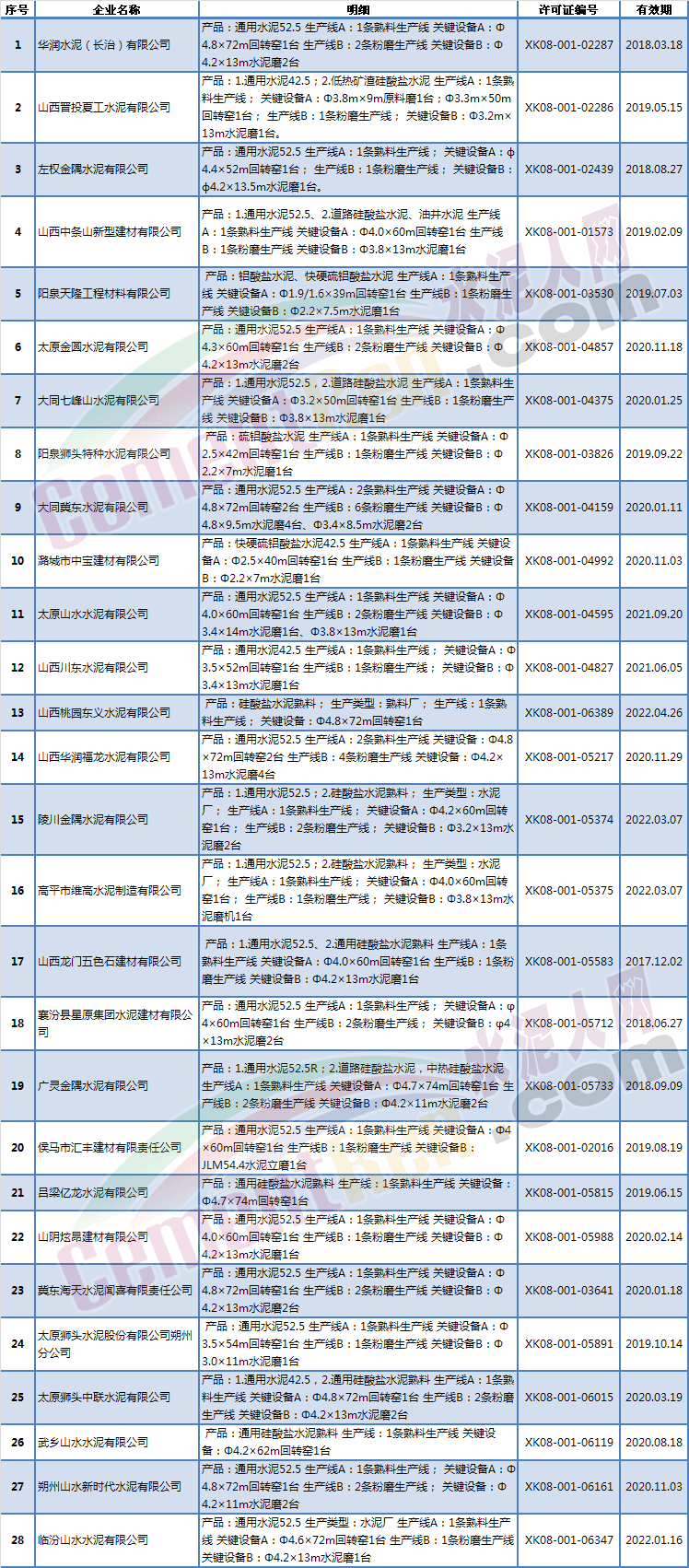 山西省熟料生產線名錄