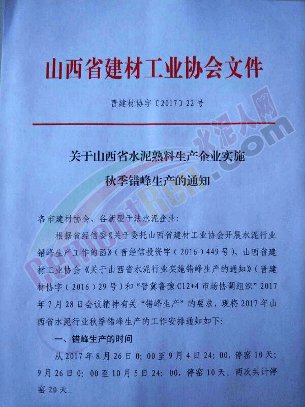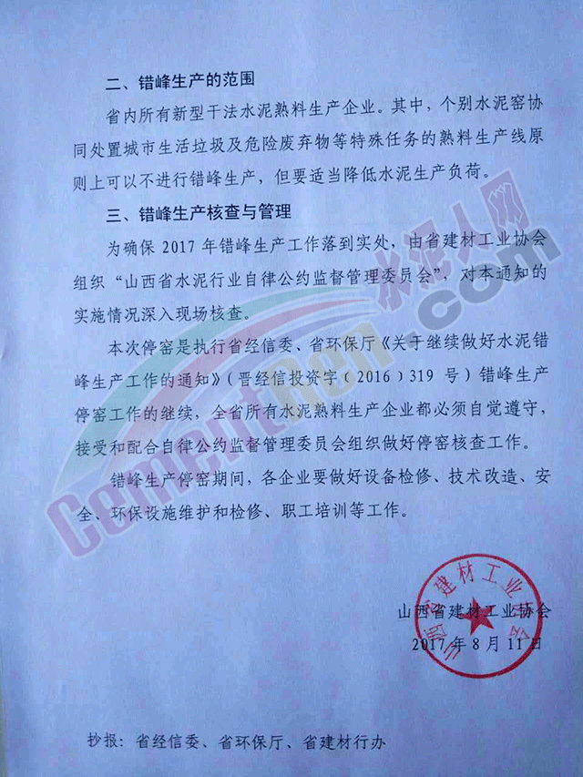 為確保2017年錯峰生產工作落到實處,由山西省建材工業(yè)協會組織“山西省水泥行業(yè)自律公約監(jiān)督管理委員會”,對本通知的實施情況深入現場核查。