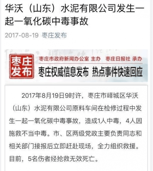 19日上午,嶧城區(qū)宣傳部發(fā)布通稿稱,2017年8月19日9時許,棗莊市嶧城區(qū)華沃(山東)水泥有限公司原料車間在檢修過程中發(fā)生一起一氧化碳中毒事故,造成1人中毒,4人因施救不當中毒。