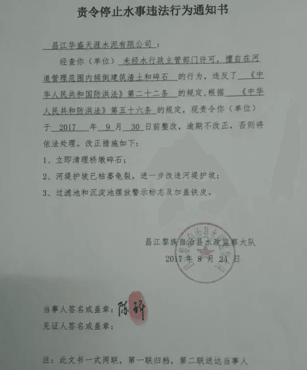 聯(lián)合執(zhí)法部門嚴肅責(zé)令華盛水泥廠接受二次《責(zé)令停止水事違法行為通知書》,要求華盛水泥廠在2017年9月30日前必須整改以下三點問題:一、立即清理橋墩碎石;二、沉淀池及過濾池須加蓋鐵皮及擺放警示標(biāo)志;三、河堤護坡已枯萎龜裂,為防止汛期雨水將泥塊沖刷入河,必須限期改造成菱形網(wǎng)格植被護坡。若限期整改效果未達到《責(zé)令停止水事違法行為通知書》所要求標(biāo)準(zhǔn),則依法接受行政處罰。