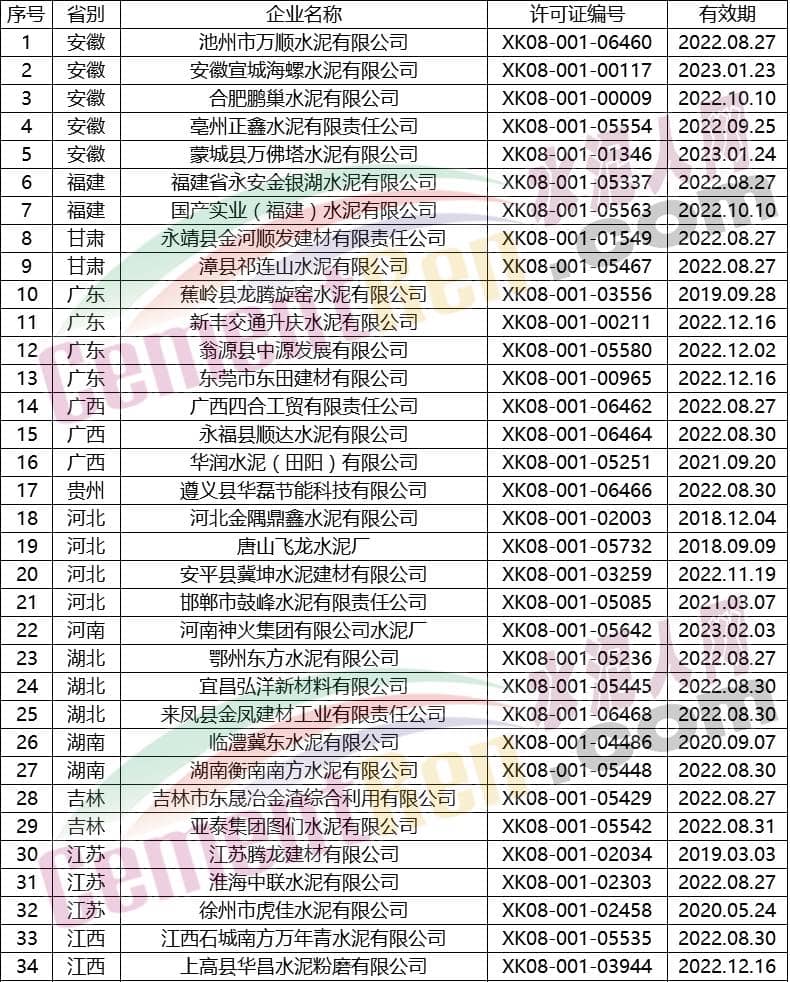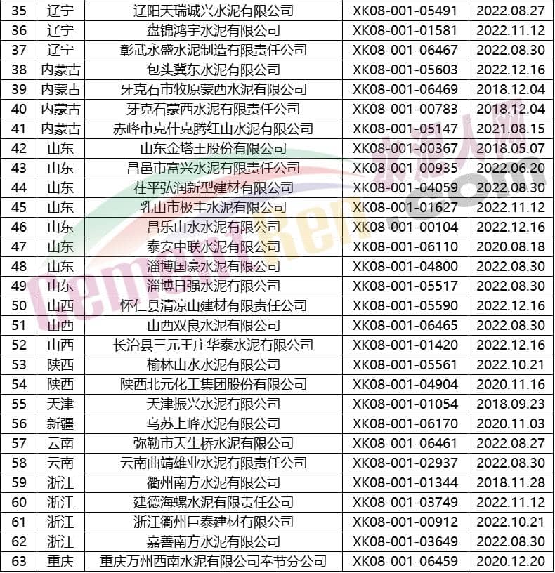 【水泥人網(wǎng)】9月9日晚間,國家質(zhì)檢總局發(fā)布8月份第6~9批獲證企業(yè)名單。經(jīng)過整理,水泥人網(wǎng)發(fā)現(xiàn),在本次公布的獲證企業(yè)名單當中,包括63家水泥企業(yè),其具體名單如下圖所示: