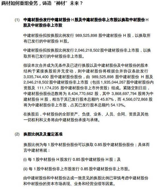 中建材股份和中材股份是中國一流、全球重要的建材企業(yè),本次合并將實(shí)現(xiàn)強(qiáng)強(qiáng)聯(lián)合,優(yōu)勢(shì)互補(bǔ),合并后中建材股份有望在產(chǎn)業(yè)布局、業(yè)務(wù)規(guī)模、產(chǎn)品和服務(wù)等方面擁有全面、綜合的競(jìng)爭(zhēng)優(yōu)勢(shì),從而進(jìn)一步提升在全球建材行業(yè)的競(jìng)爭(zhēng)力。預(yù)期合并后中建材股份將是全球水泥產(chǎn)能排名第一的企業(yè);并在商品混凝土生產(chǎn)、水泥工程服務(wù)、石膏板生產(chǎn)、玻纖制造(考慮中建材股份聯(lián)營公司中國巨石)、風(fēng)機(jī)葉片生產(chǎn)等多個(gè)領(lǐng)域擁有世界領(lǐng)先地位。