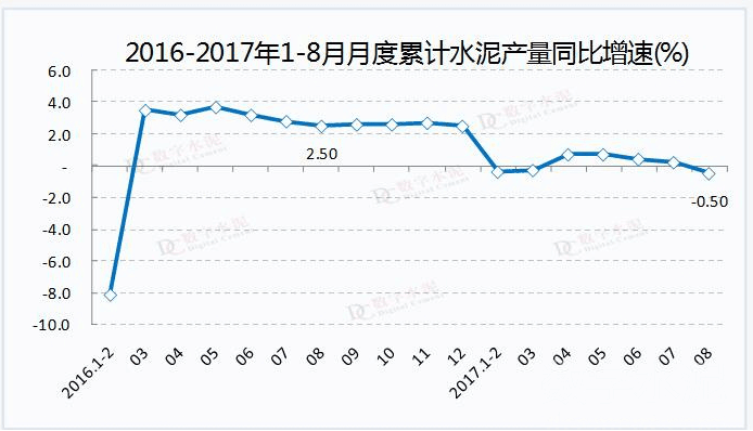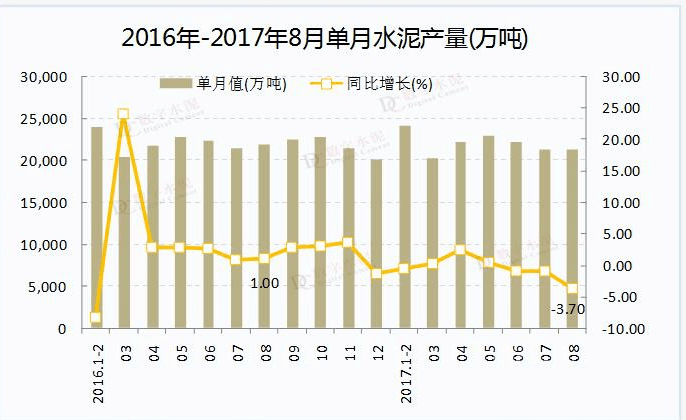 今年多數(shù)地區(qū)開始實施水泥夏季錯峰生產,加上環(huán)保督察力度不斷加大,水泥市場需求受到影響,8月份,全國單月水泥產量與上月相比降幅較小,但同比下降明顯;前8個月全國累計水泥產量同比呈現(xiàn)出負增長,但降幅不大。