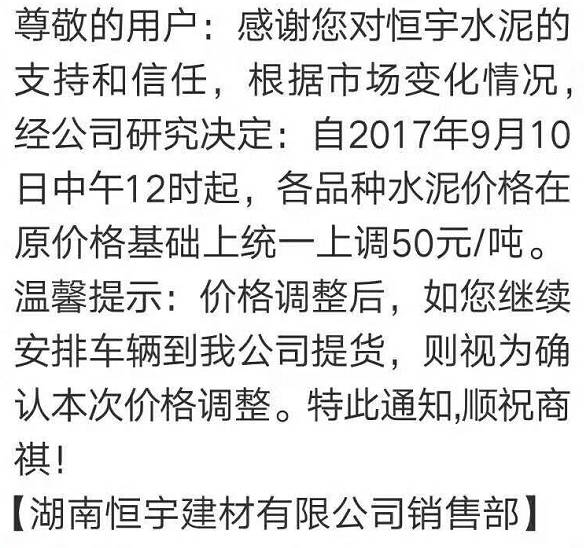 根據(jù)當(dāng)前市場(chǎng)形勢(shì)及產(chǎn)銷存情況,我公司決定于2017年9月14日上午8:00對(duì)各品種水泥上調(diào)30元/噸,如您繼續(xù)安排提貨,則視為認(rèn)同此次價(jià)格調(diào)整。