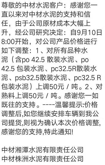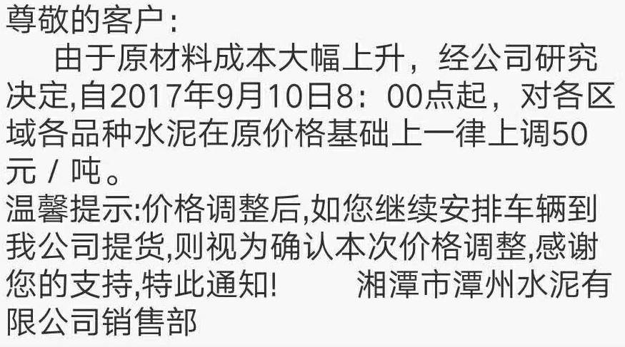 感謝您對(duì)我公司長(zhǎng)期以來(lái)的信賴與支持,根據(jù)近期市場(chǎng)變化及公司產(chǎn)銷形勢(shì),決定于2017年9月14日8:00起對(duì)水泥各品種價(jià)格上調(diào)20元/噸,熟料價(jià)格上調(diào)30元/噸。順祝商祺!