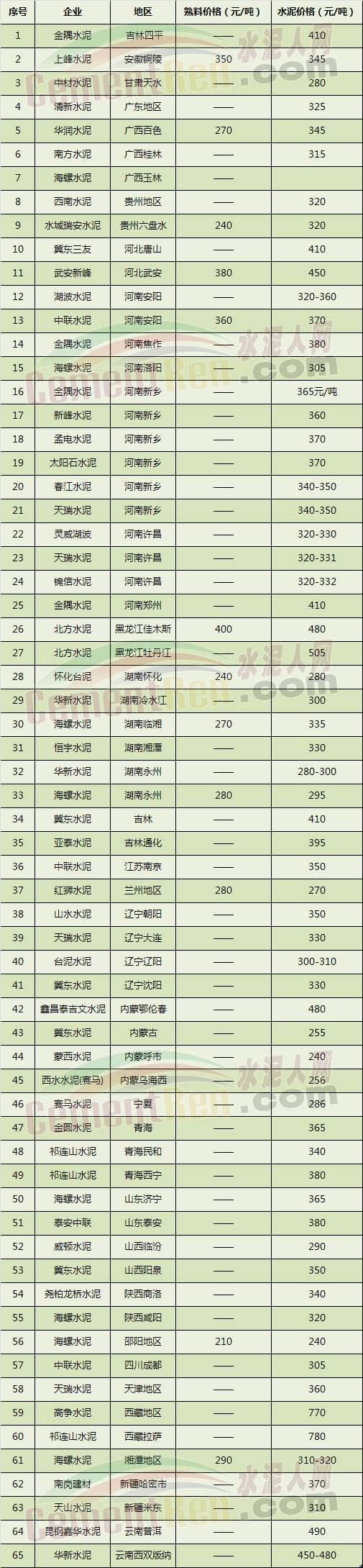 熟料、水泥價(jià)格一覽