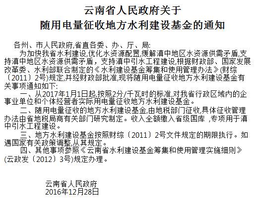 云南省政府2016年12月28日文件《云南省人民政府關(guān)于隨用電量征收地方水利建設(shè)基金的通知》(云政發(fā)〔2016〕108號),以及火電補(bǔ)貼基金,加上滇中飲水工程使得金沙江上游水直接引入滇中區(qū)域,金沙江中下游水量降低,水電發(fā)電量也會下降,以上都將導(dǎo)致水泥行業(yè)生產(chǎn)電力成本上漲(每月達(dá)幾百萬甚至上千萬元)。