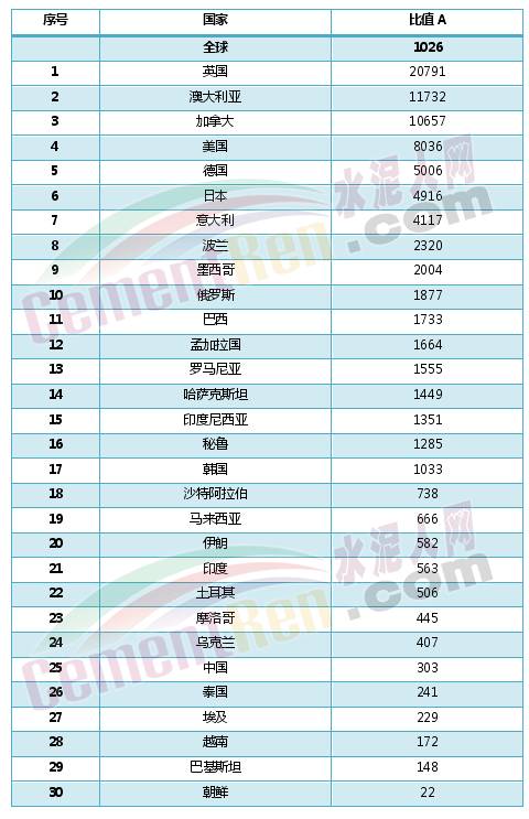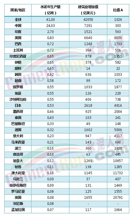 我們把世界各國中水泥年產(chǎn)量在700萬噸以上的國家的水泥產(chǎn)量(能找到的最新數(shù)據(jù),大部分?jǐn)?shù)據(jù)為2015、2016年,見附表1)、建筑業(yè)增加值(2014年數(shù)據(jù))列出來,然后用建筑業(yè)增加值(單位億美元)比水泥年產(chǎn)量(單位億噸),得到了下面的數(shù)據(jù)(嚴(yán)格來說,我們應(yīng)該取同一年份的數(shù)據(jù)來計(jì)算比值,但確實(shí)小編能獲取到的數(shù)據(jù)有限,2014-2016年這幾項(xiàng)數(shù)據(jù)應(yīng)該來說并沒有大的波動(dòng),所以我們?nèi)钥梢酝ㄟ^比值看到大的趨勢和特征),按照水泥年產(chǎn)量來進(jìn)行排序: