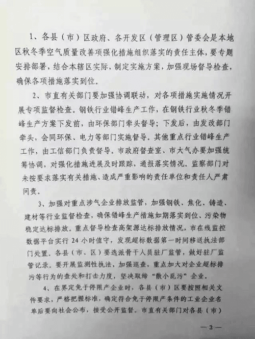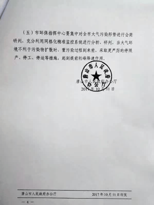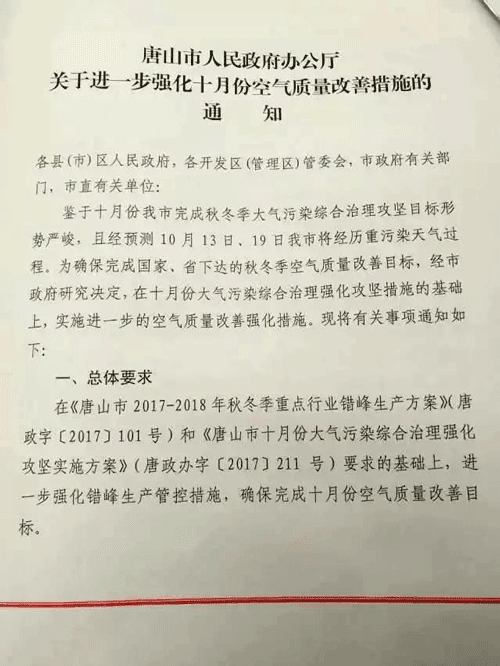 通知稱之所以提前啟動錯(cuò)峰生產(chǎn)是因?yàn)槭路萏粕绞型瓿汕锒敬髿馕廴揪C合治理攻堅(jiān)目標(biāo)形勢嚴(yán)峻,且經(jīng)預(yù)測10月13日、19日唐山市將經(jīng)歷重污染天氣過程。為確保完成國家、省下達(dá)的秋冬季空氣質(zhì)量改善目標(biāo),經(jīng)唐山市政府研究決定,在十月份大氣污染綜合治理強(qiáng)化攻堅(jiān)措施的基礎(chǔ)上,實(shí)施進(jìn)一步的空氣質(zhì)量改善強(qiáng)化措施。
