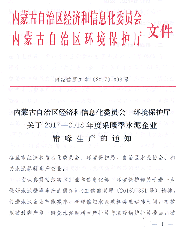 近日,內(nèi)蒙古自治區(qū)經(jīng)信委聯(lián)合內(nèi)蒙古環(huán)保廳發(fā)布《關(guān)于2017-2018年度采暖季水泥企業(yè)錯峰生產(chǎn)的通知》。通知稱:為認(rèn)真貫徹落實《工業(yè)和信息化部 環(huán)境保護部關(guān)于進一步做好水泥錯峰生產(chǎn)的通知》精神,促進水泥企業(yè)節(jié)能減排,合理縮短水泥熟料裝置運轉(zhuǎn)時間,有效壓減過剩產(chǎn)能,避免水泥熟料生產(chǎn)排放與取暖鍋爐排放疊加,減輕采暖期大氣污染,經(jīng)研究決定,對2017-2018年度采暖季水泥企業(yè)(含利用電石渣)做如下安排,認(rèn)真貫徹執(zhí)行。